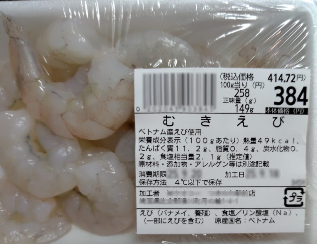 ・リン酸塩(Na)はむきえびの水分を保持させる作用があります。